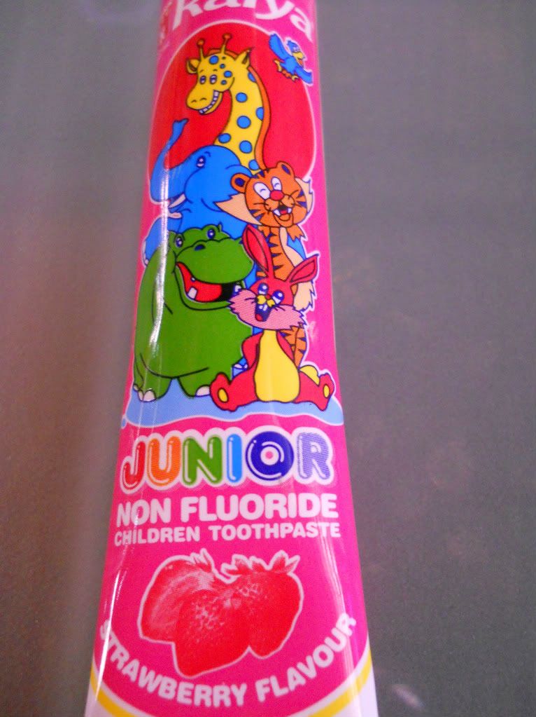 Punyalah cerewet anak dara I ni, tak mahu toothpaste yang lain. Nak yang dia selalu pakai tu je la. Merata mother cari ke sana sini, siap minta kawan kawan tolong tinjau tinjaukan. Masih tak jumpa lagi tempat yang ada jual toothpaste tu kat JB, mungkin belum jelajah banyak tempat, kawan kawan pun tolong carikan tapi tak jumpa. Oleh kerana toothpastenya dah memang kehabisan hingga picitan yang terakhir (sorry! mother tak bawa stock balik JB sebab ikut rancangan kita cuma balik raya je, tapi lama pulak kat JB sebab Tok Abah sakit), terpaksa lah beli toothpaste yang ada dijual di Tesco. Perisa strawberry, Raiya or Raiyya or something like that la. Tapi...ya ampon, memang Alma tak nak brush teeth langsung!